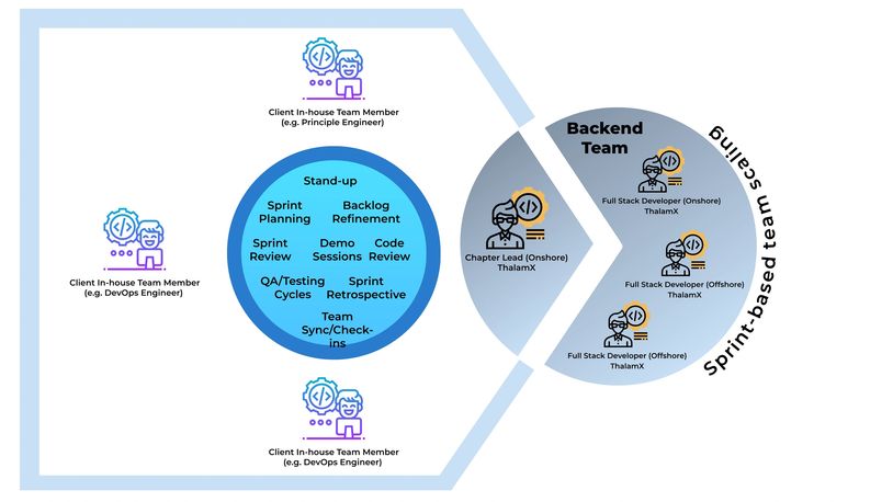We pair experienced onshore Chapter Lead with a scalable offshore Full Stack Development team, forming a sprint-ready squad that plugs into your agile cycle.